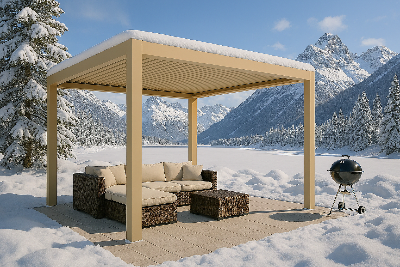 A bioklimatikus pergola nemcsak nyári árnyékoló, hanem négyévszakos kültéri megoldás. A lamellák állításával tavasszal és ősszel is kellemes mikroklíma alakítható ki, míg a kiegészítő fűtés és az oldalfalak hűvösebb napokon is komfortossá teszik a teret. Így a terasz valódi élettérré válik.